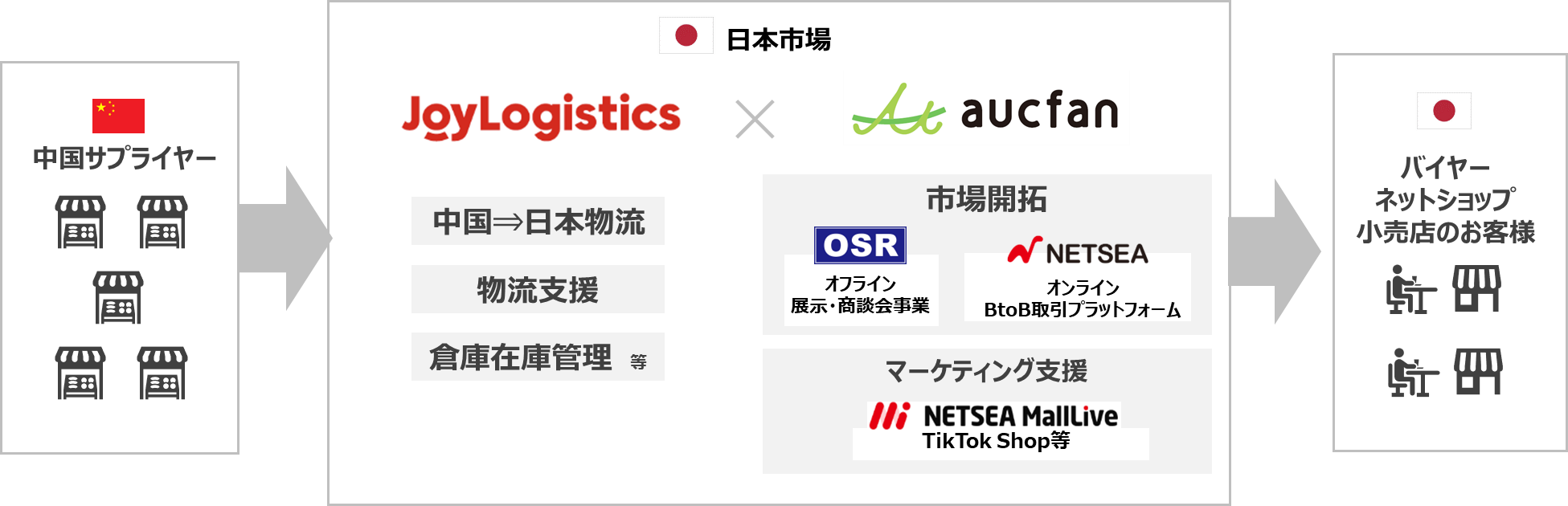 オークファングループ、JoyLogistics(京東物流)の連携により、中国サプライヤーの商品を日本国内の小売事業者へ流通させる仕組みを整備していきます。