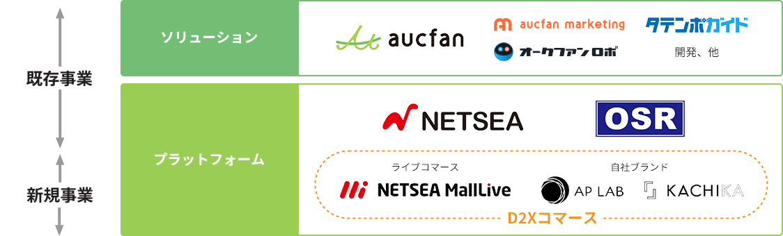 既存事業として、相場検索サービス「オークファン」およびBtoB取引プラットフォーム「NETSEA」を運営し、安定的な収益基盤を構築しています。